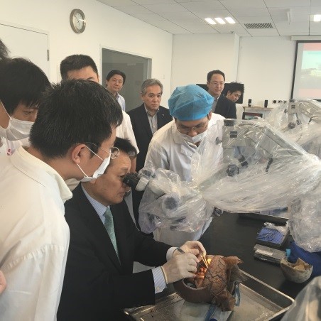 此次会议有幸特邀到了在颅底肿瘤,脑血管疾病等领域享誉世界的 Dr. Fukushima 教授。他在日本、美国、欧洲多个国家拥有“神手”之美誉。 应天津环湖医院神经外科佟小光主任的邀请,福岛教授还在8月5日参观了天津环湖医院,并在显微外科解剖室里亲自与医院年轻医生当面讲解解剖要点,回答年轻医生的问题。